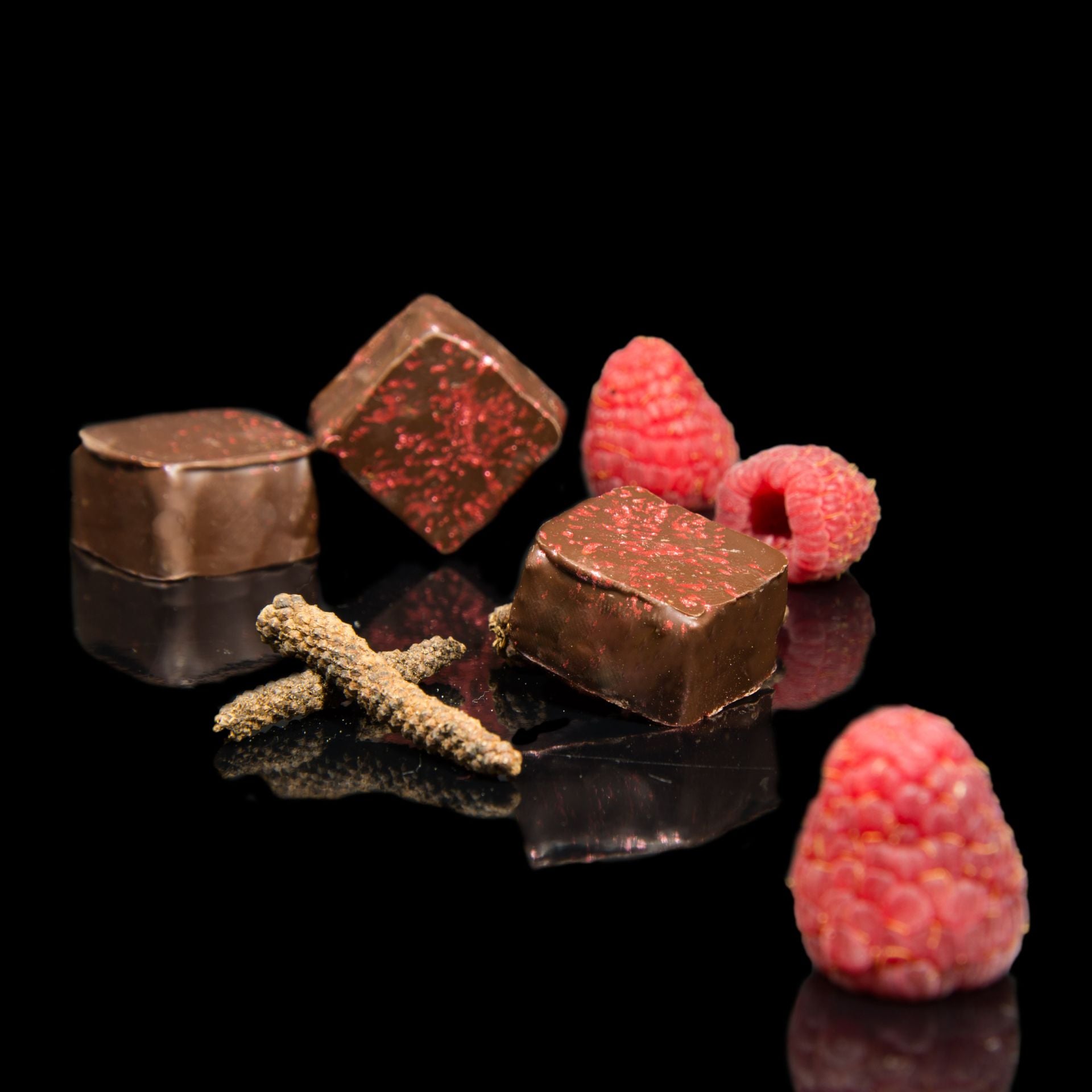 Eine besonders raffinierte Variante einer Marzipanpraline mit den frischen Aromen des Ingwers und exotischen Anklängen des rosa Pfeffers. Saftig und vollmundig in einer knackigen Hülle aus dunkler Schokolade.